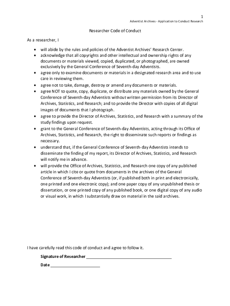 1Adventist Archives Application to Conduct ResearchResearcher Code of Conduct As a researcher, I will abide by the rules and policies of the Adventist Archives Research Center. Acknowledge that all