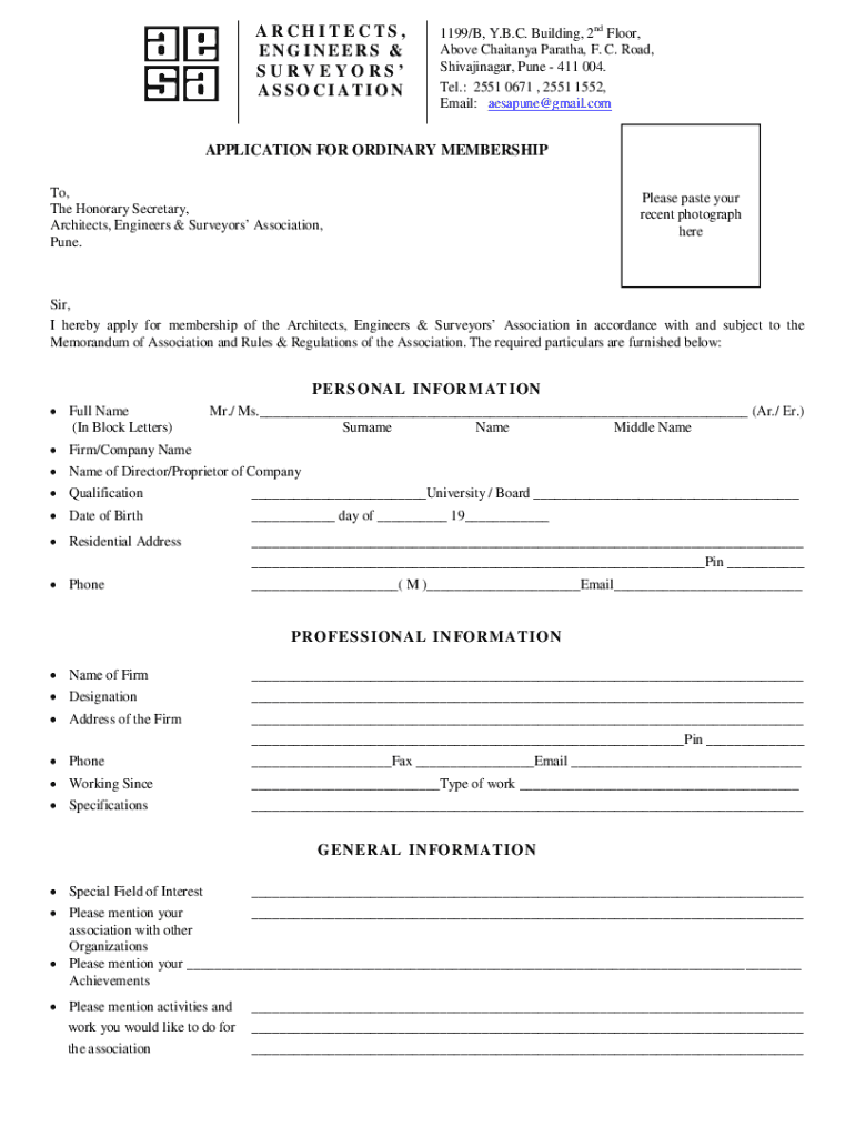 ARCHITECTS, ENGINEERS & SURVEYORS ASSOCIATION1199/B, Y.B.C. Building, 2nd Floor, Above Chaitanya Maratha, F. C. Road, Shivajinagar, Pune 411 004. Tel.: 2551 0671, 2551 1552, Email: aesapune Gmail.