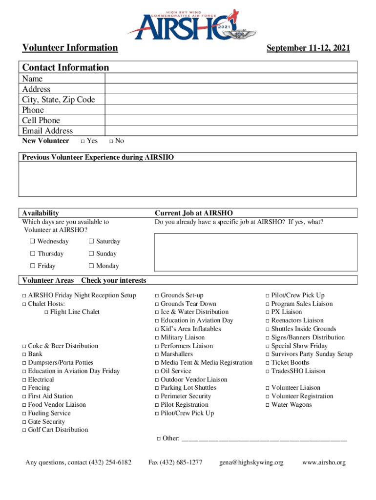Volunteer Information September 1112, 2021Contact Information Name Address City, State, Zip Code Phone Cell Phone Email Address New Volunteer Yes Previous Volunteer Experience during AIRSHOAvailabilityCurrent