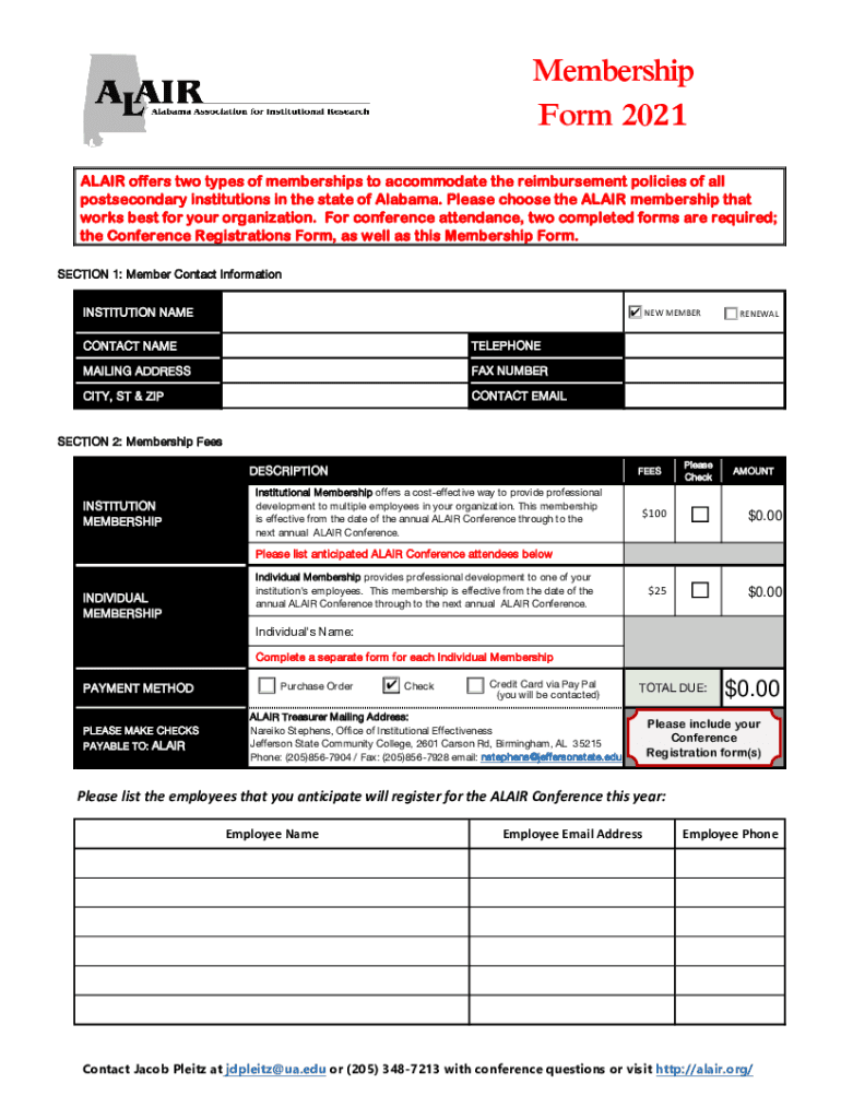 Membership Form 2021 BLAIR offers two types of memberships to accommodate the reimbursement policies of all postsecondary institutions in the state of Alabama. Please choose the BLAIR membership that