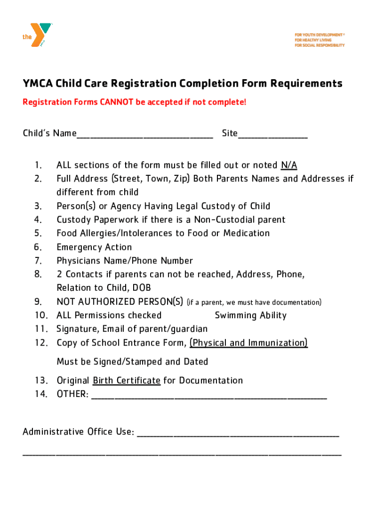 Get the free YMCA Child Care Registration Completion Form Requirements