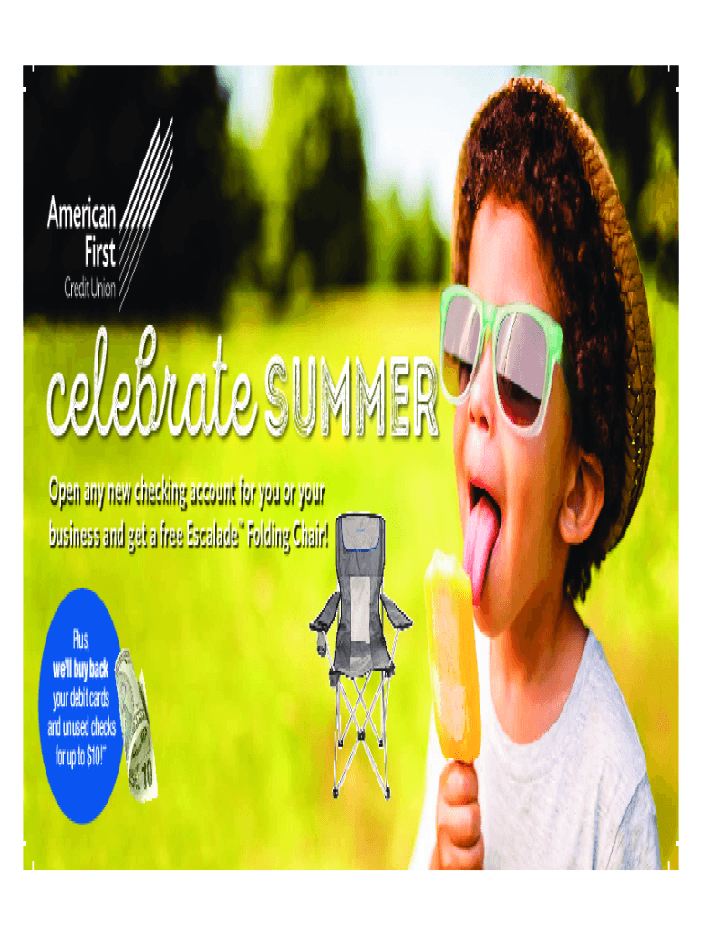 Celebrate summer Open any new checking account for you or your business and get a free Escalade Folding Chair! Plus, well buy back your debit cards and unused checks for up to $10!**omboTellAFriend,