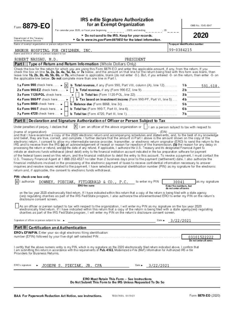 Form8879EOIRS file Signature Authorization for an Exempt Organization For calendar year 2020, or fiscal year beginning OMB No. 15450047, 2020, and ending, 202020G Do not send to the IRS. Keep for