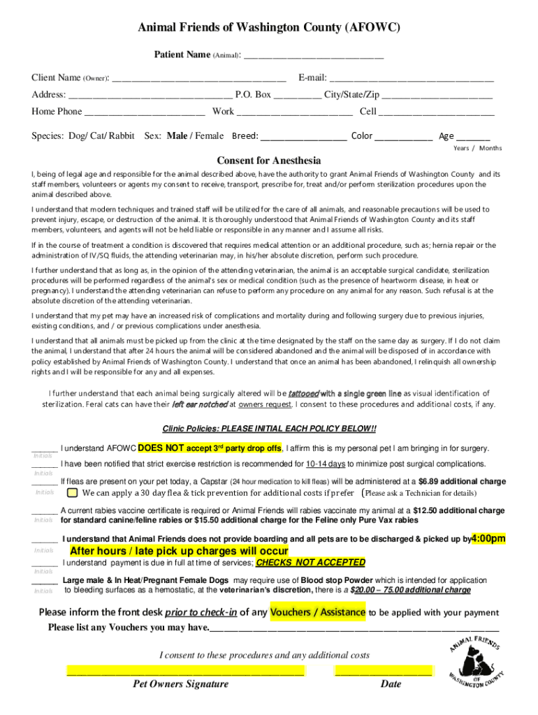 Animal Friends of Washington County (AFO WC) Patient Name (Animal): Client Name (Owner): Email: Address: P.O. Box City/State/Zip Home Phone Work Cell Species: Dog/ Cat/ Rabbit Sex: Male / Female Breed: