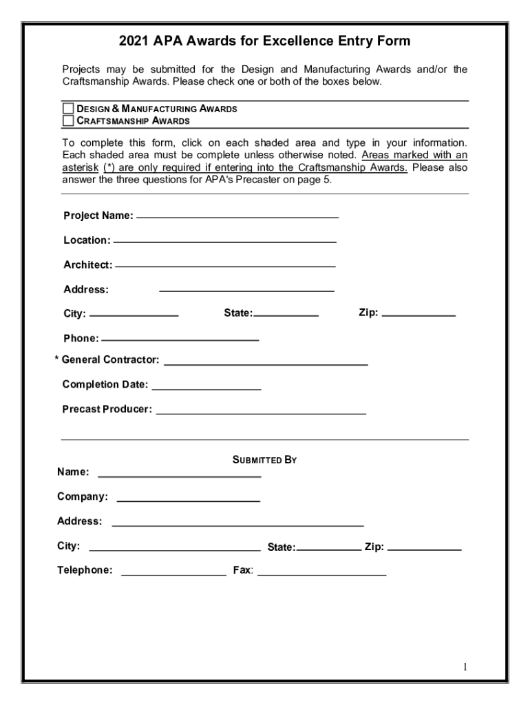 2021 APA Awards for Excellence Entry Form Projects may be submitted for the Design and Manufacturing Awards and/or the Craftsmanship Awards. Please check one or both of the boxes below. DESIGN & MANUFACTURING