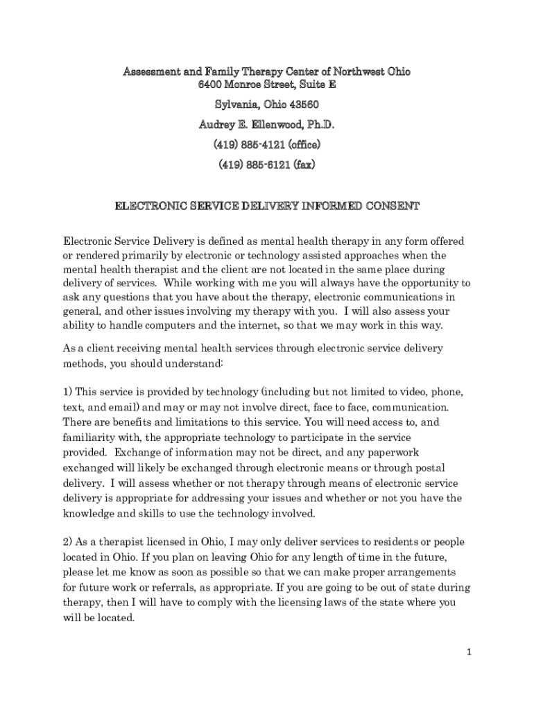 Assessment and Family Therapy Center of Northwest Ohio 6400 Monroe Street, Suite E Sylvia, Ohio 43560 Audrey E. Ellen wood, Ph.D. (419) 8854121 (office) (419) 8856121 (fax)ELECTRONIC SERVICE DELIVERY
