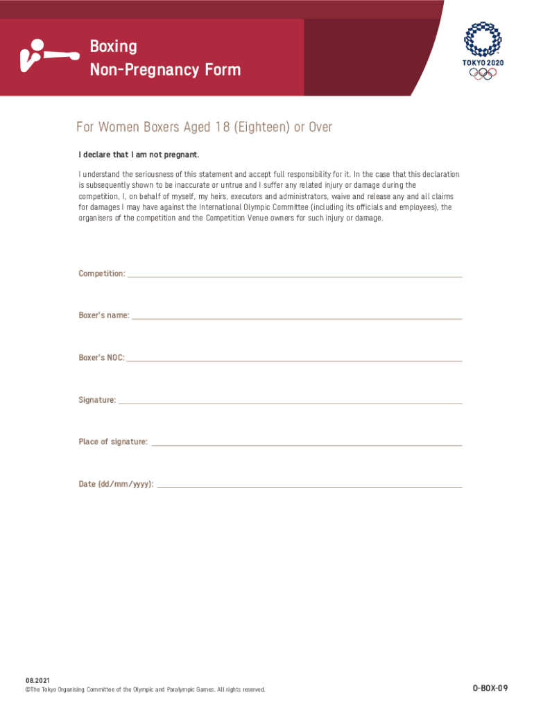 Boxing Pregnancy Former Women Boxers Aged 18 (Eighteen) or Over I declare that I am not pregnant. I understand the seriousness of this statement and accept full responsibility for it. In the case