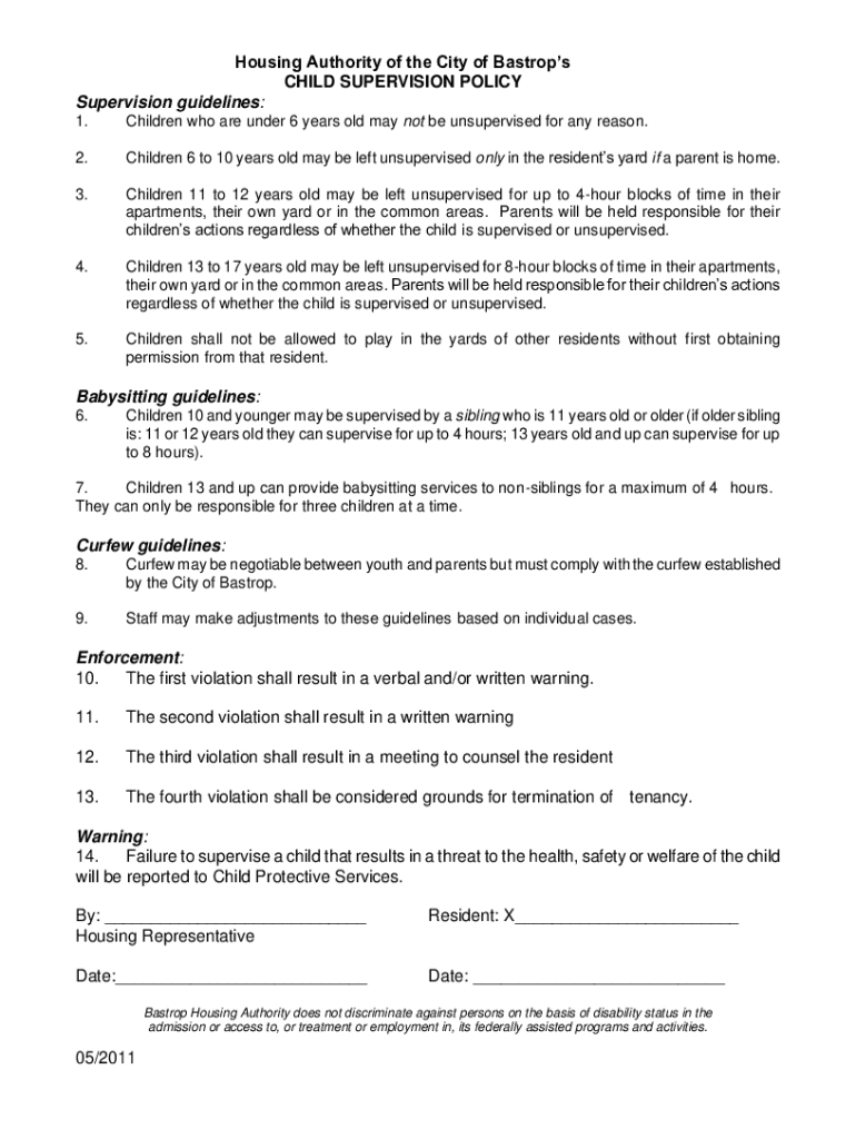 Housing Authority of the City of Ba strops CHILD SUPERVISION POLICY Supervision guidelines: 1. Children who are under 6 years old may not be unsupervised for any reason.2. Children 6 to 10 years old