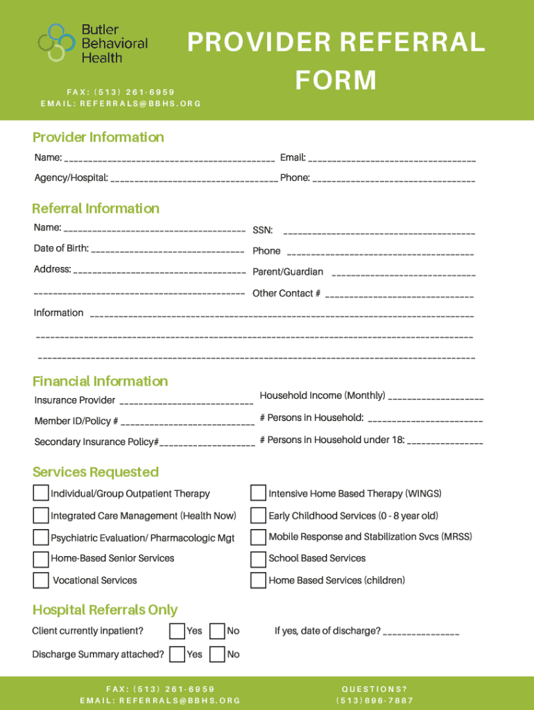 PROVIDER REFERRAL FORM FAX: (513) 2616959 EMAIL: REFERRALS BBS. Provider Information Name: Email: Agency/Hospital: Phone: Referral Information Name: SSN: Date of Birth: Phone Address: Parent/Guardian