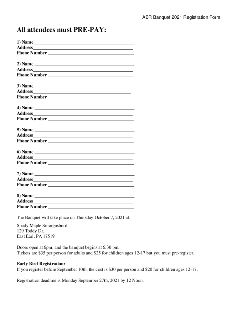 ABR Banquet 2021 Registration Formal attendees must PREPAY: 1) Name Address Phone Number 2) Name Address Phone Number 3) Name Address Phone Number 4) Name Address Phone Number 5) Name Address Phone