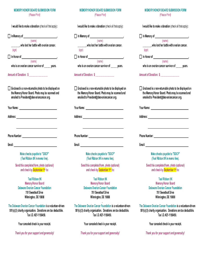 MEMORY/HONOR BOARD SUBMISSION FORM (Please Print)MEMORY/HONOR BOARD SUBMISSION FORM (Please Print)MEMORY/HONOR BOARD SUBMISSION FORM (Please Print)I would like to make a donation (check all that apply):I
