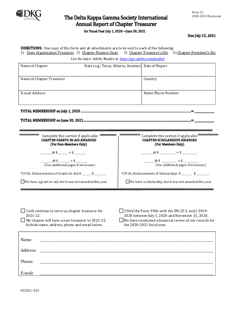 The Delta Kappa Gamma Society International Annual Report of Chapter TreasurerForm 15 20202021 Fiscal year for Fiscal Year July 1, 2020June 30, 2021Due July 15, 2021, DIRECTIONS: One copy of this