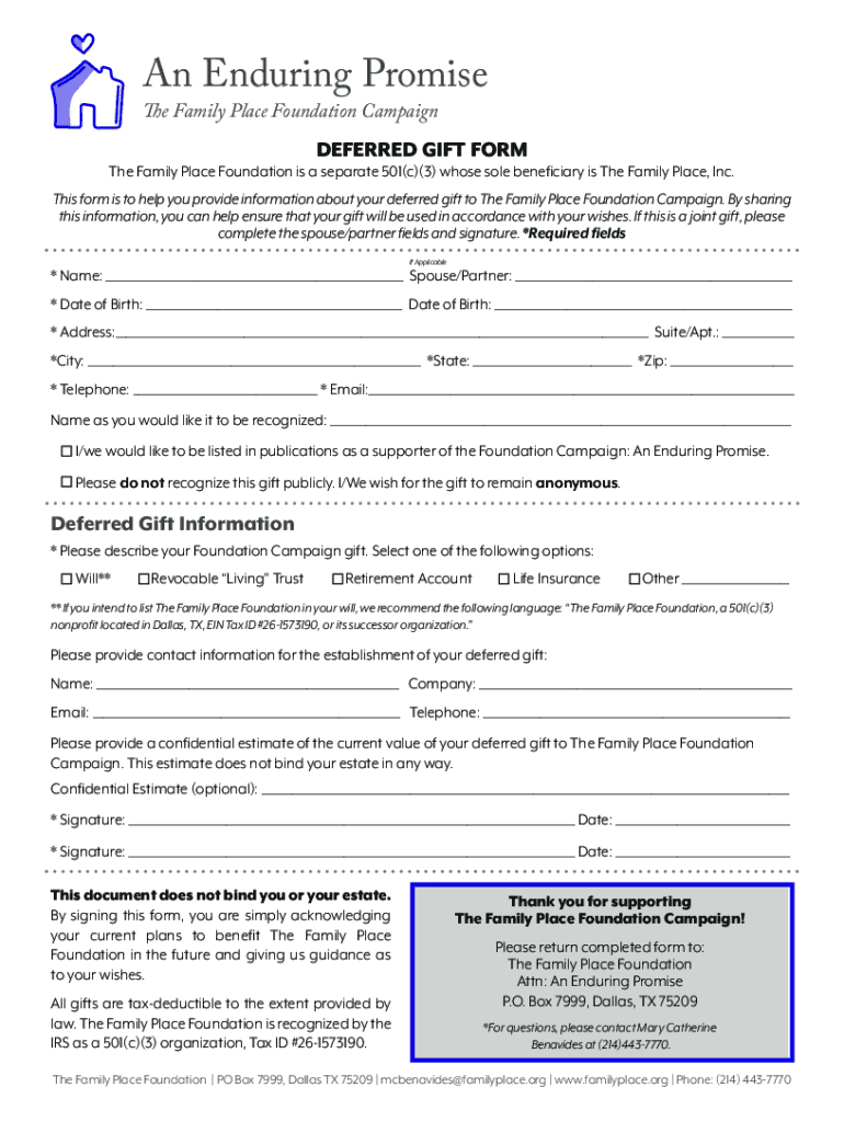 An Enduring Promise The Family Place Foundation CampaignDEFERRED GIFT From The Family Place Foundation is a separate 501(c)(3) whose sole beneficiary is The Family Place, Inc. This form is to help