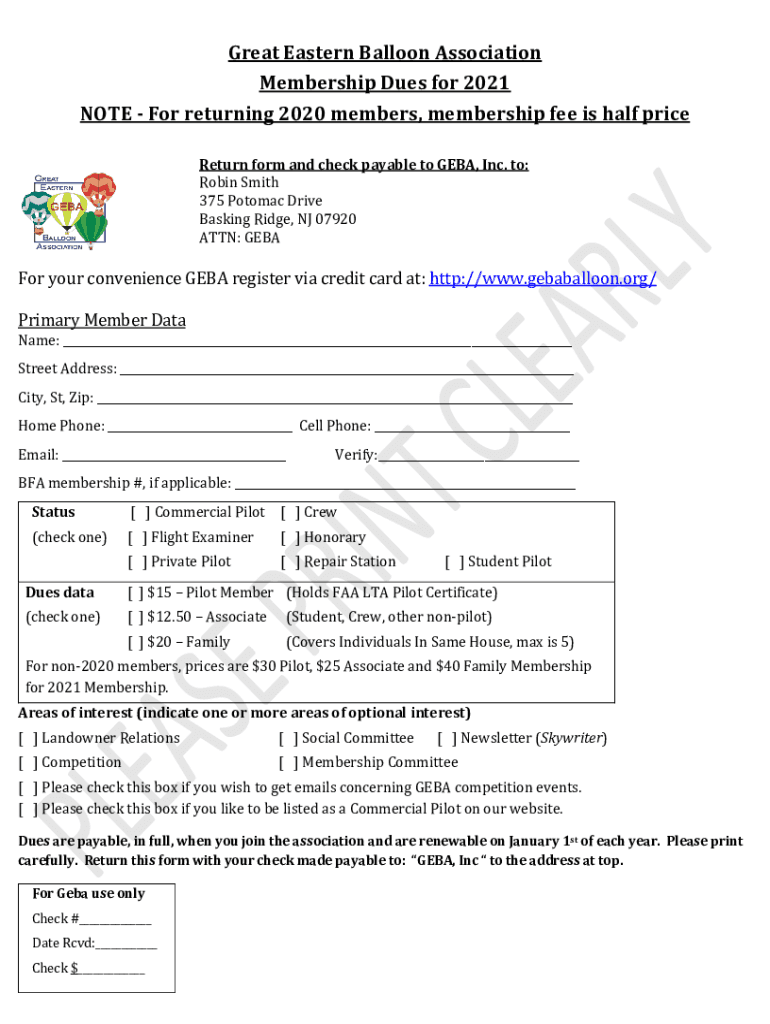 Great Eastern Balloon Association Membership Dues for 2021 NOTE For returning 2020 members, membership fee is half price Return form and check payable to GBA, Inc. to: Robin Smith 375 Potomac Drive