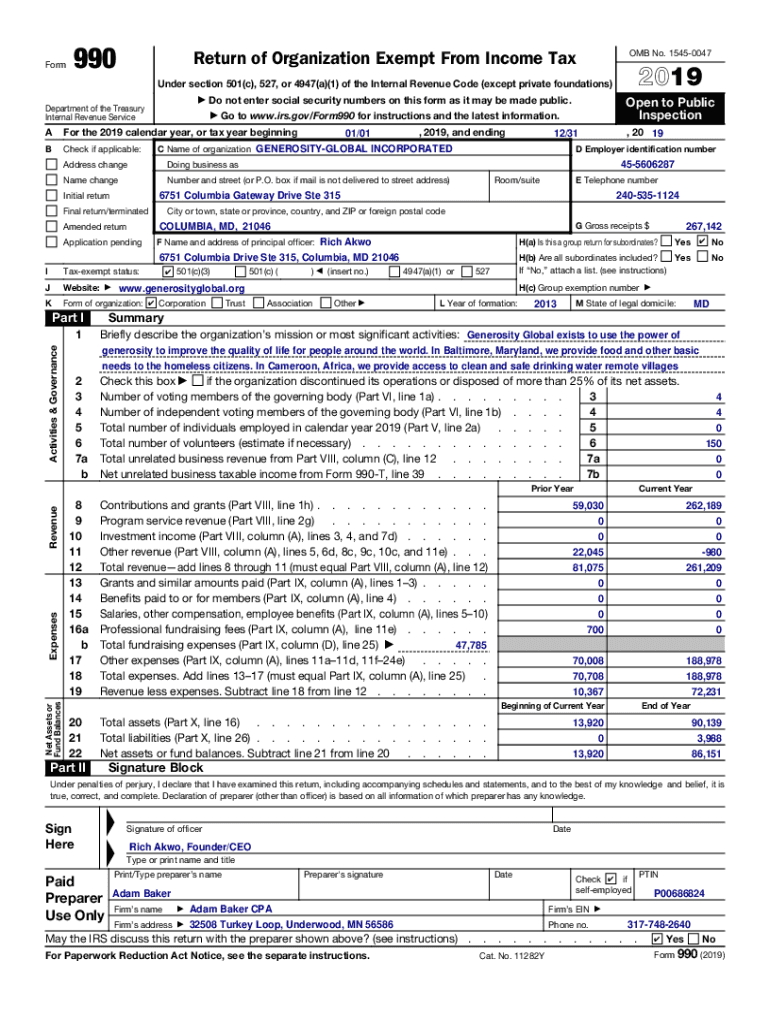 Form990package 64 - generosityglobalorg requires details on the organization's revenue, expenditures, assets, liabilities, governance structure, and more.