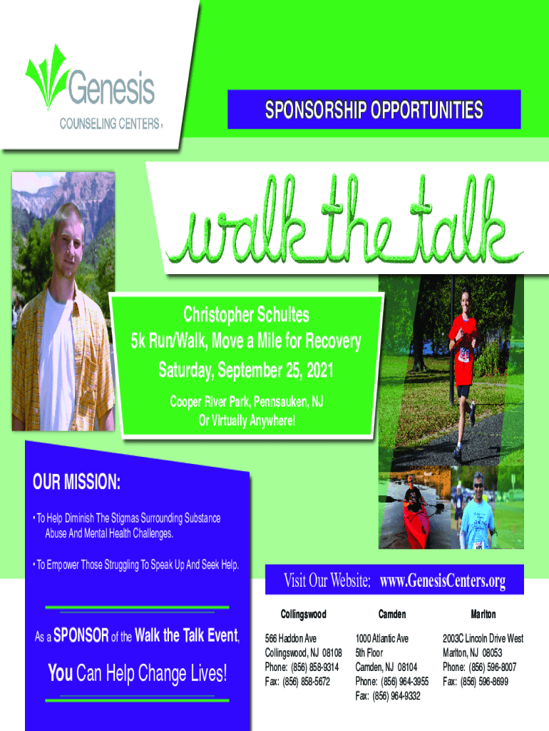SPONSORSHIP OPPORTUNITIES Christopher Schultz 5k Run/Walk, Move a Mile for Recovery Saturday, September 25, 2021, Cooper River Park, Pennsauken, NJ Or Virtually Anywhere!OUR MISSION: To Help Diminish