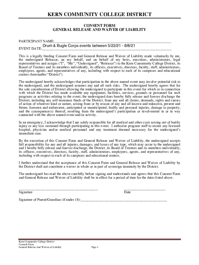KERN COMMUNITY COLLEGE DISTRICT CONSENT FORM GENERAL RELEASE AND WAIVER OF LIABILITY PARTICIPANT NAME: Drum & Bugle Corps events between 5/22/21 8/8/21EVENT DATE: This is a legally binding Consent