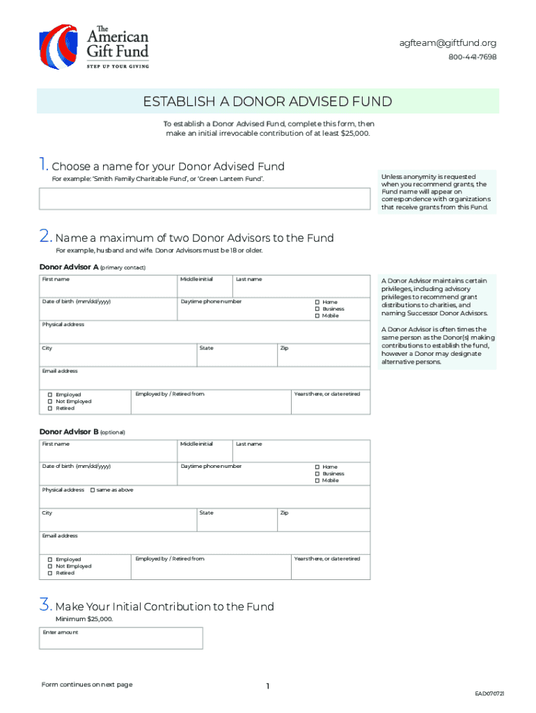 Agfteam@giftfund.org 8004417698ESTABLISH A DONOR ADVISED FUND To establish a Donor Advised Fund, complete this form, then make an initial irrevocable contribution of at least $25,000.1. Choose a name