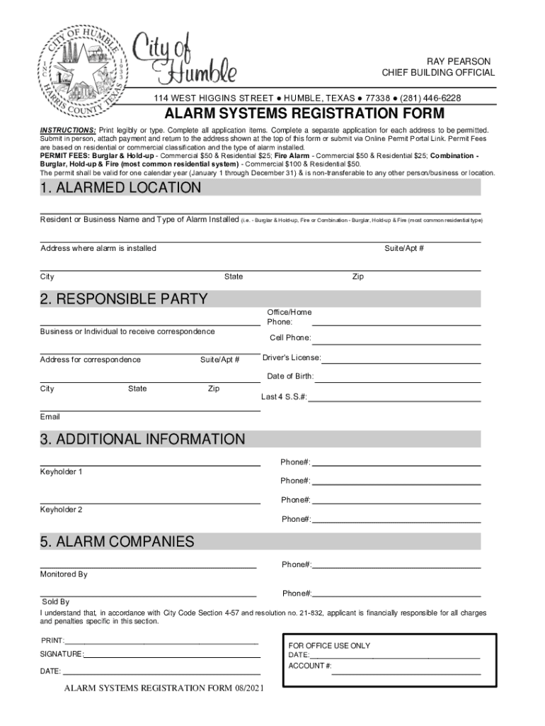 RAY PEARSON CHIEF BUILDING OFFICIAL 114 WEST HIGGINS STREET HUMBLE, TEXAS 77338 (281) 4466228ALARM SYSTEMS REGISTRATION FORM INSTRUCTIONS: Print legibly or type. Complete all application items. Complete