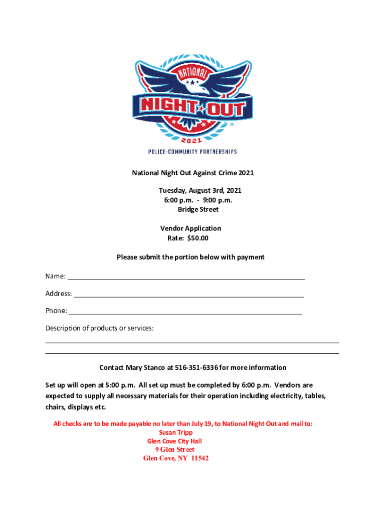 National Night Out Against Crime 2021 Tuesday, August 3rd, 2021 6:00 p.m. 9:00 p.m. Bridge Street Vendor Application Rate: $50.00 Please submit the portion below with payment Name: Address: Phone: