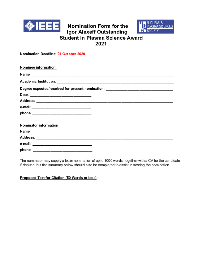 Get the free Nomination Form for the Igor Alexeff Outstanding Student ...