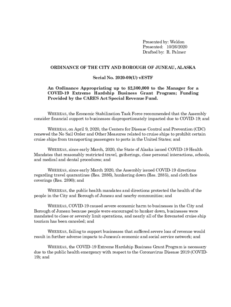 Presented by: Weldon Presented: 10/26/2020 Drafted by: R. Palmer ORDINANCE OF THE CITY AND BOROUGH OF JUNEAU, ALASKA Serial No. 202009(U) vest An Ordinance Appropriating up to $2,300,000 to the Manager