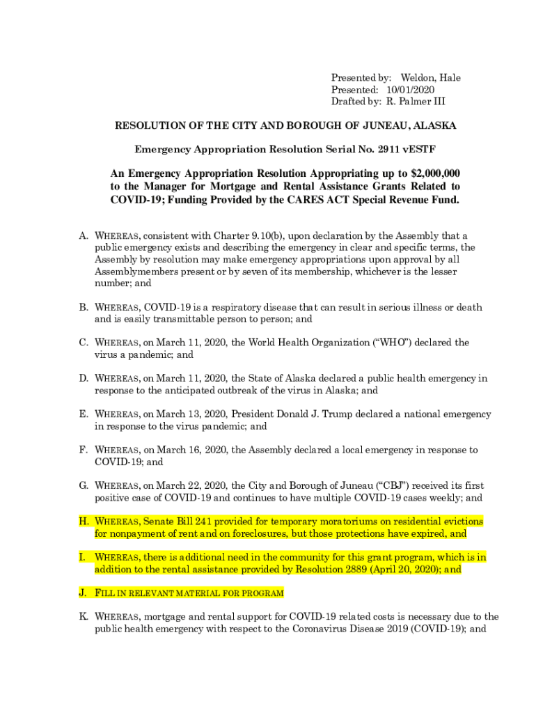 Presented by: Weldon, Hale Presented: 10/01/2020 Drafted by: R. Palmer III RESOLUTION OF THE CITY AND BOROUGH OF JUNEAU, ALASKA Emergency Appropriation Resolution Serial No. 2911 Vesta Emergency Appropriation