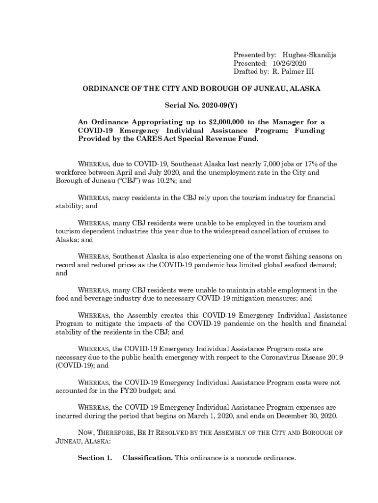 Presented by: HughesSkandijs Presented: 10/26/2020 Drafted by: R. Palmer III ORDINANCE OF THE CITY AND BOROUGH OF JUNEAU, ALASKA Serial No. 202009(Y) An Ordinance Appropriating up to $2,000,000 to