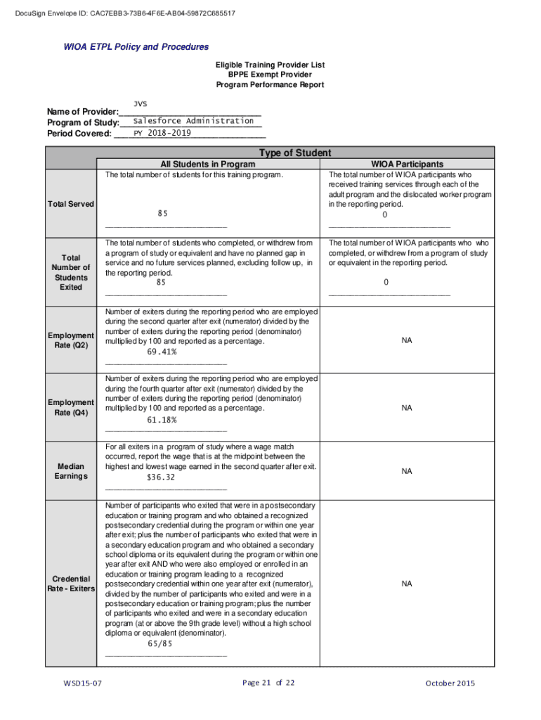 DocuSign Envelope ID: CAC7EBB373B64F6EAB0459872C685517WIOA EPL Policy and Procedures Eligible Training Provider List BPCE Exempt Provider Program Performance Reports Name of Provider: Salesforce Administration