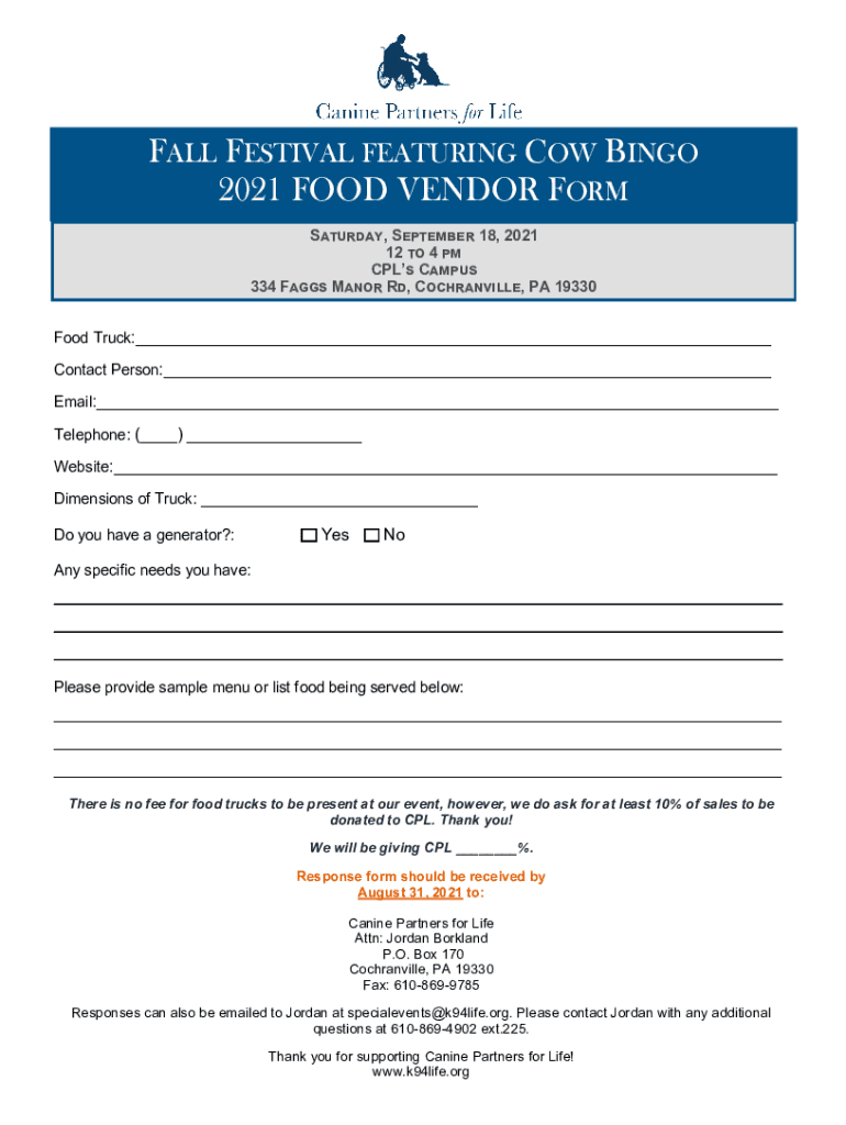 FALL FESTIVAL FEATURING COW BINGO 2021 FOOD VENDOR FORM Saturday, September 18, 2021 12 to 4 pm CLS Campus 334 Fangs Manor Rd, Cochranville, PA 19330 Food Truck: Contact Person: Email: Telephone: