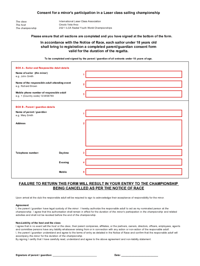 Consent for a minors' participation in a Laser class sailing championship International Laser Class Association Circle Vela Arc 2021 INCA Radial Youth World Championships class The host The championshipPlease