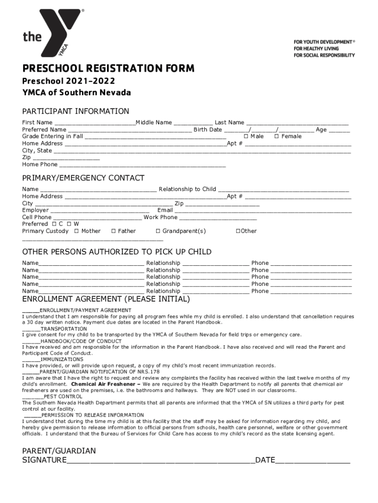 PRESCHOOL REGISTRATION FORM Preschool 20212022 YMCA of Southern Nevada PARTICIPANT INFORMATION First Name Middle Name Last Name Preferred Name Birth Date / / Age Grade Entering in Fall Male Female