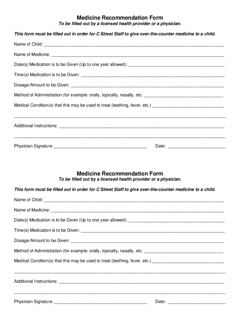 Medicine Recommendation Form To be filled out by a licensed health provider or a physician. This form must be filled out in order for C Street Staff to give overthecounter medicine to a child. Name