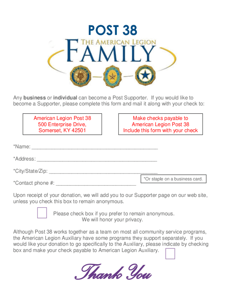 POST 38Any business or individual can become a Post Supporter. If you would like to become a Supporter, please complete this form and mail it along with your check to: American Legion Post 38 500