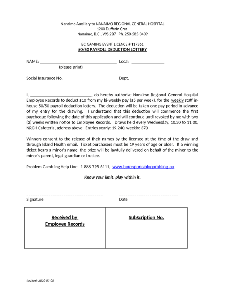 Nanaimo Auxiliary to NANAIMO REGIONAL GENERAL HOSPITAL 1200 Duffer in Crew. Nanaimo, B.C., V9S 2B7 pH. 2505850409 BC GAMING EVENT License # 11736150/50 PAYROLL DEDUCTION LOTTERY NAME: Local: (please