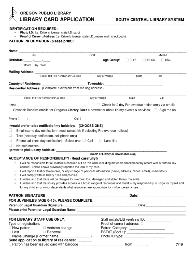 OREGON PUBLIC LIBRARYLIBRARY CARD APPLICATIONSOUTH CENTRAL LIBRARY SYSTEMIDENTIFICATION REQUIRED: Photo I.D. (i.e. Driver's license, state I.D. card) Proof of Current Address (i.e. Driver's license,