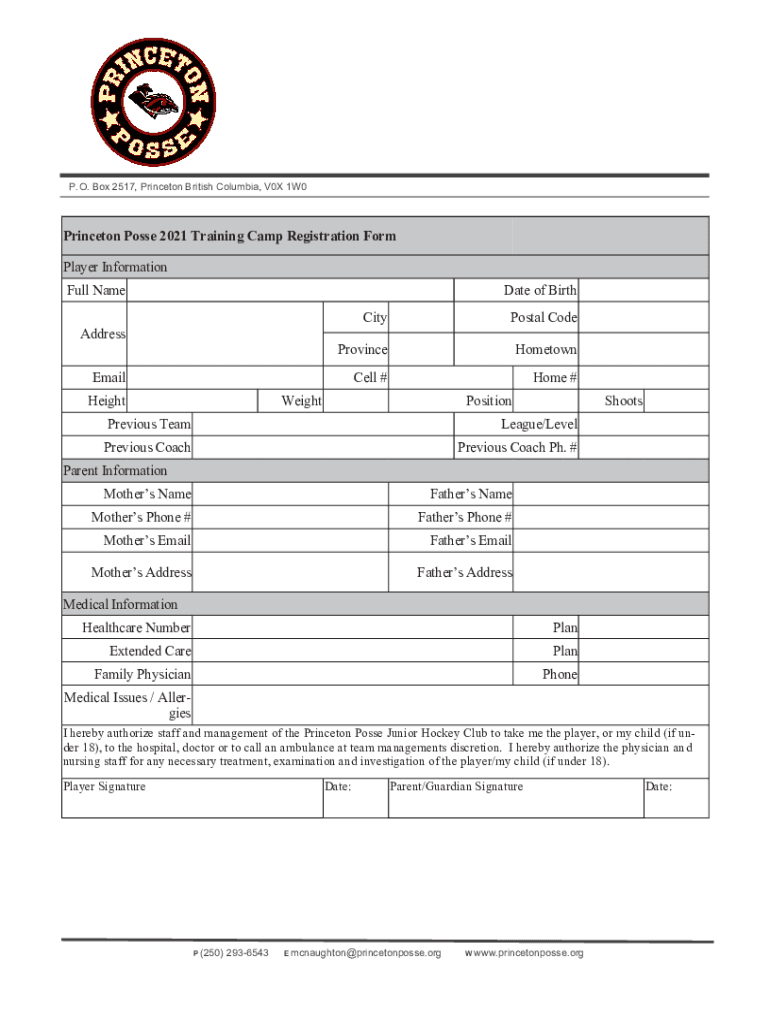 P.O. Box 2517, Princeton British Columbia, V0X 1W0Princeton Posse 2021 Training Camp Registration Formulated Information Full Name Date of BirthAddressCityPostal CodeProvinceHometownCell #Home #Email