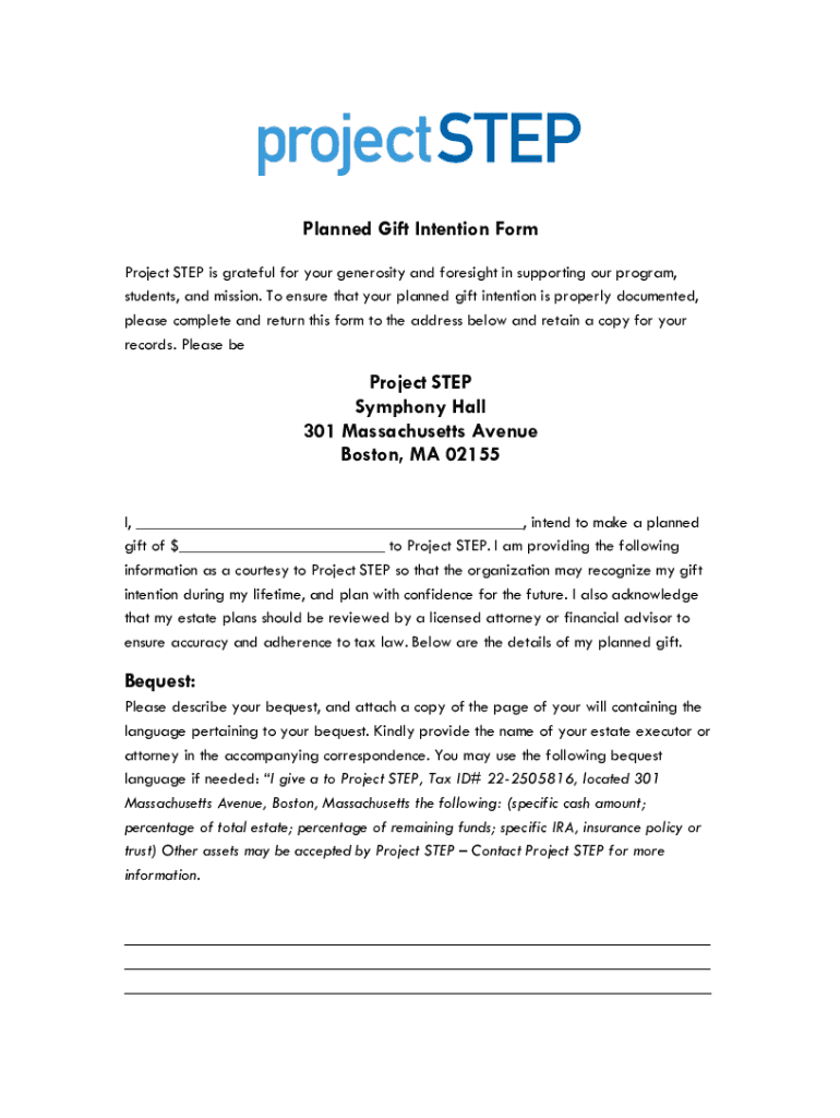 Planned Gift Intention Form Project STEP is grateful for your generosity and foresight in supporting our program, students, and mission. To ensure that your planned gift intention is properly documented,