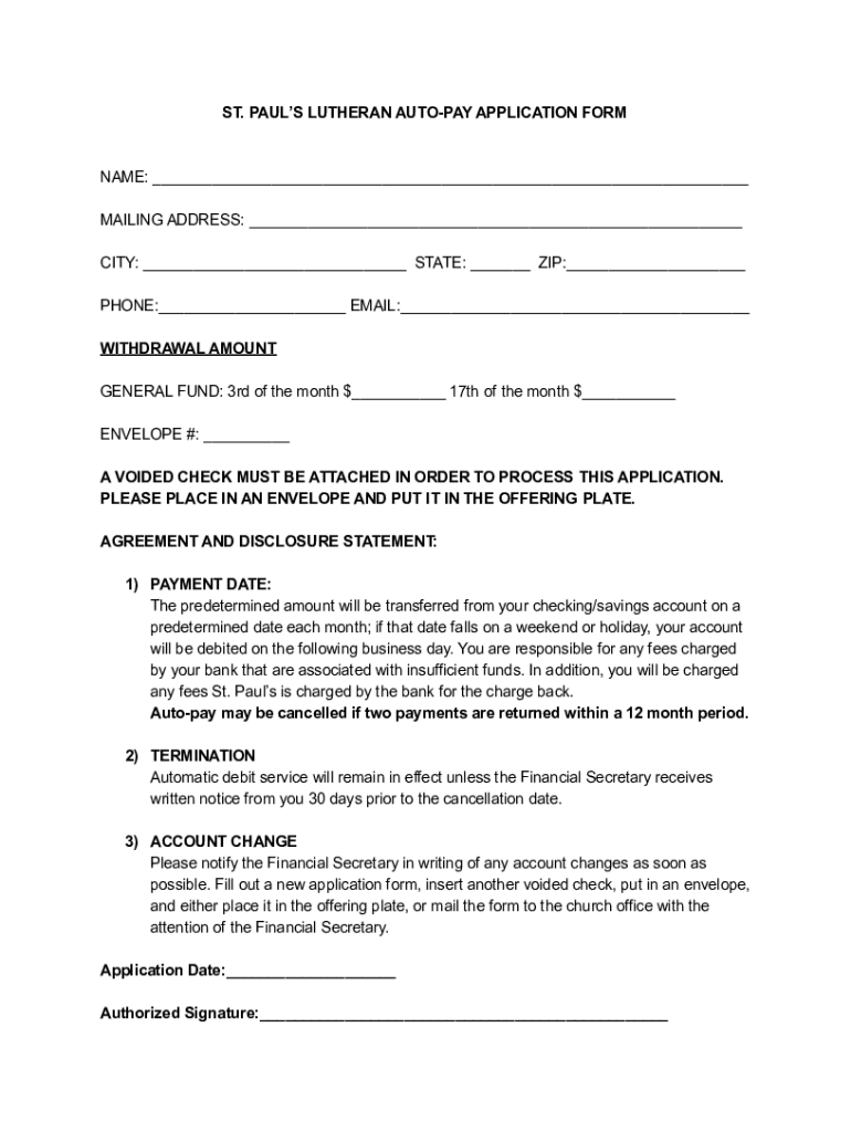 ST. PAUL LUTHERAN AUTOPAY APPLICATION FORENAME: MAILING ADDRESS: CITY: STATE: ZIP: PHONE: EMAIL: WITHDRAWAL AMOUNT GENERAL FUND: 3rd of the month $ 17th of the month $ ENVELOPE #: A VOIDED CHECK MUST