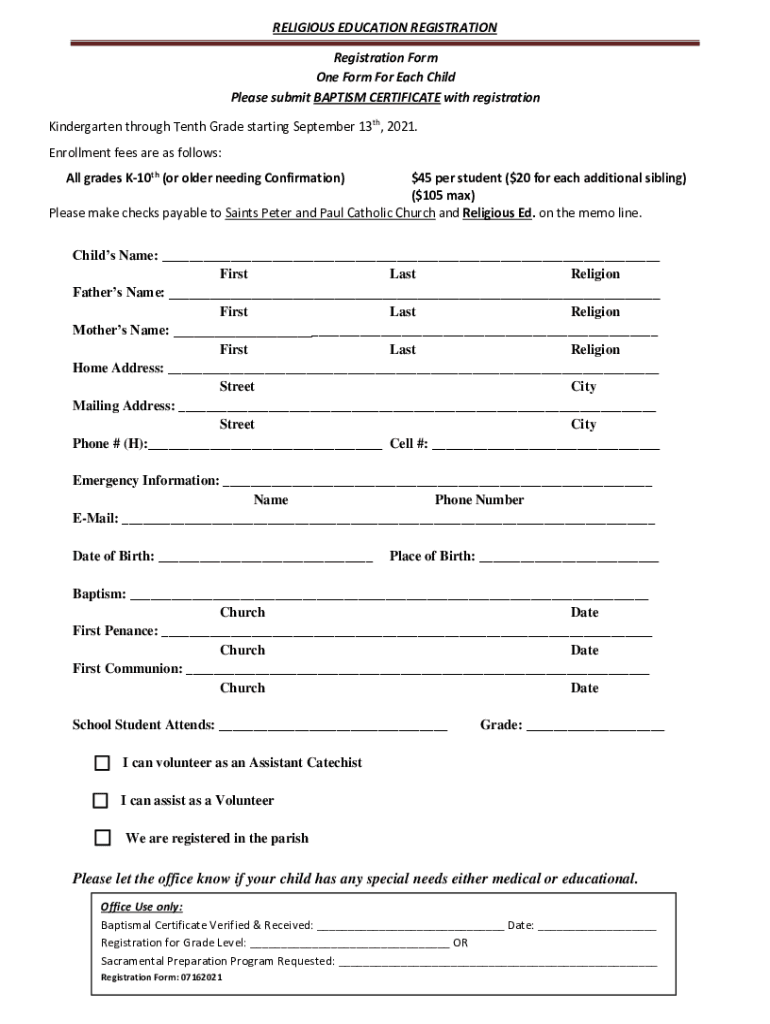 RELIGIOUS EDUCATION REGISTRATION Form One Form For Each Child Please submit BAPTISM CERTIFICATE with registration Kindergarten through Tenth Grade starting September 13th, 2021. Enrollment fees are