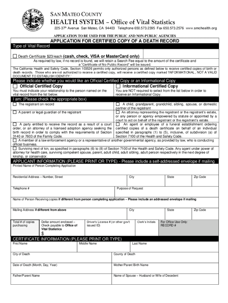SAN MATEO COUNTYHEALTH SYSTEM Office of Vital Statistics 22537th Avenue San Mateo, CA 94403 Telephone 650.573.2395 Fax 650.573.2576 www.smchealth.org APPLICATION TO BE USED FOR THE PUBLIC AND NONPUBLIC