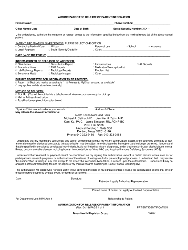 AUTHORIZATION FOR RELEASE OF PATIENT INFORMATION Patient Name: Phone Number: Other Names Used: Date of Birth: Social Security Number: XXX I, the undersigned, authorize the release of or request access