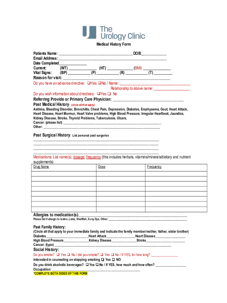 Medical History Form Patients Name: DOB: Email Address: Date Completed Current: (WT) (HT) (BMI) Vital Signs: (BP) (P) (R) (T) Reason for visit: Do you have an advance directive: Yes No / Name: Relationship