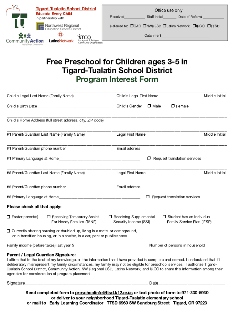 Parents or guardians who are interested in enrolling their child in a preschool program are required to file the preschool program interest form.