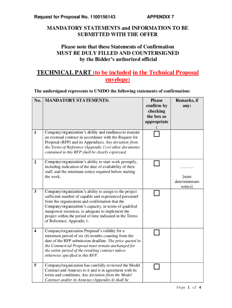 Request for Proposal No. 1100156143APPENDIX 7MANDATORY STATEMENTS and INFORMATION TO BE SUBMITTED WITH THE OFFER Please note that these Statements of Confirmation MUST BE DULY FILLED AND COUNTERSIGNED