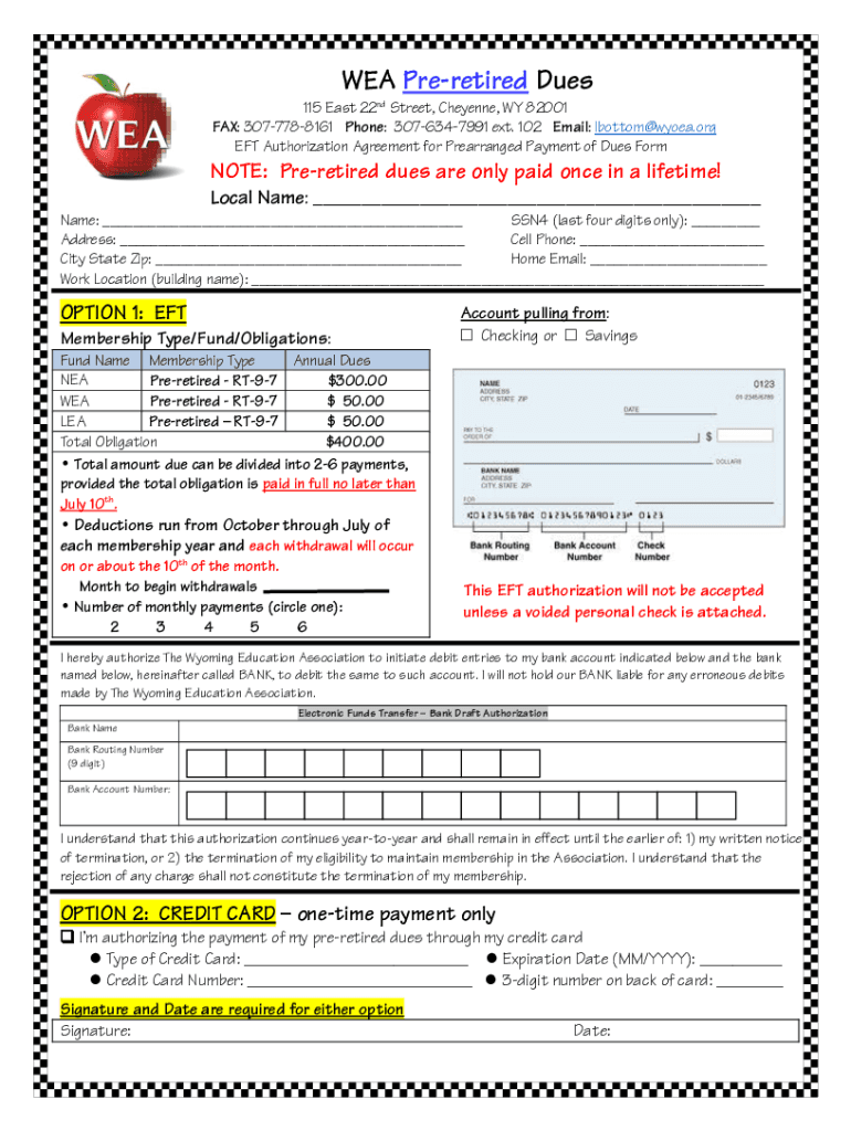 Information such as personal details, membership status, contribution amount, and payment method must be reported on online wea pre-retired dues.