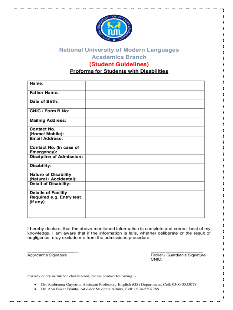 National University of Modern Languages Academics Branch (Student Guidelines) Proforma for Students with Disabilities Name: Father Name: Date of Birth: CNIC / Form B No: Mailing Address: Contact No.