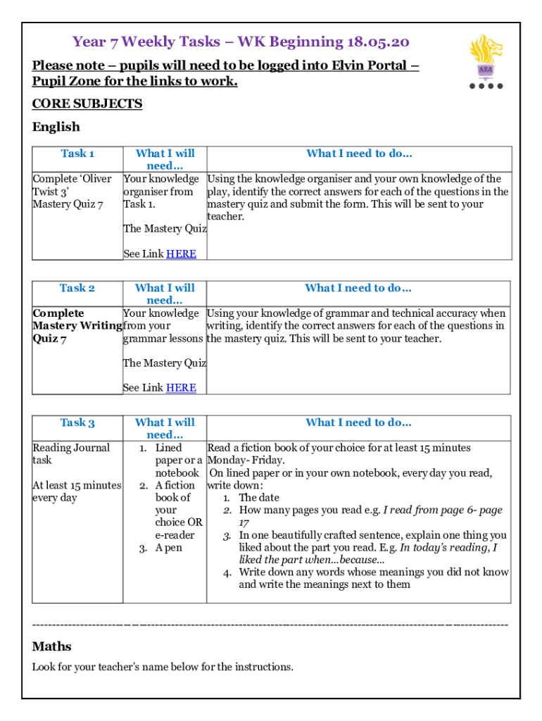 Get the free Year 7 Weekly Tasks WK Beginning 18.05 - ARK Elvin Academy
