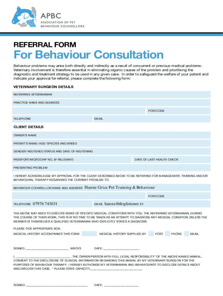 Fill out your behavioural consults - dogs online with pdfFiller!