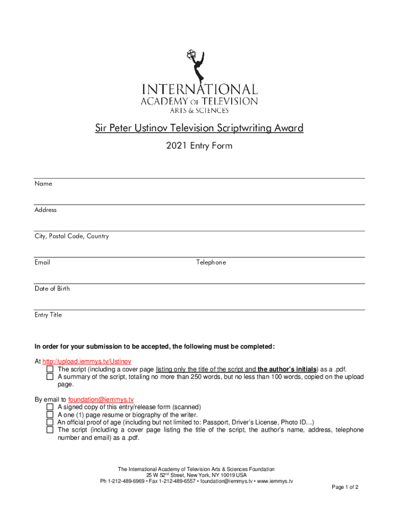 Sir Peter Ustinov Television Scriptwriting Award 2021 Entry FormNameAddressCity, Postal Code, CountryEmailTelephoneDate of Birther Title In order for your submission to be accepted, the following